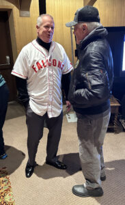 Times Observer photo by Scott Kindberg At left, Jeff Newman, son of the late Jamestown Falcons’ slugger Johnny Newman, talks with Durwood Swanson of Lakewood at the Jamestown Tarp Skunks annual meeting at the Robert H. Jackson Center on Saturday. Swanson, now 91, was in attendance for the first game at Municipal Stadium in May 1941 when Johnny Newman made his debut with the Falcons.