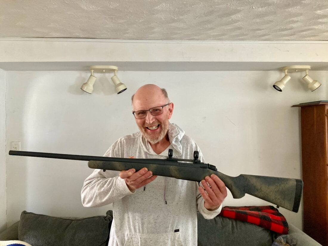 James Reitz, a member of the Kalbfus Rod & Gun Club, displays the Bergara B-14 Wilderness Hunter Rifle with a hand-painted camouflage synthetic stock and sniper gray cerakote barrel that he won in the club’s gun raffle. Submitted photo
