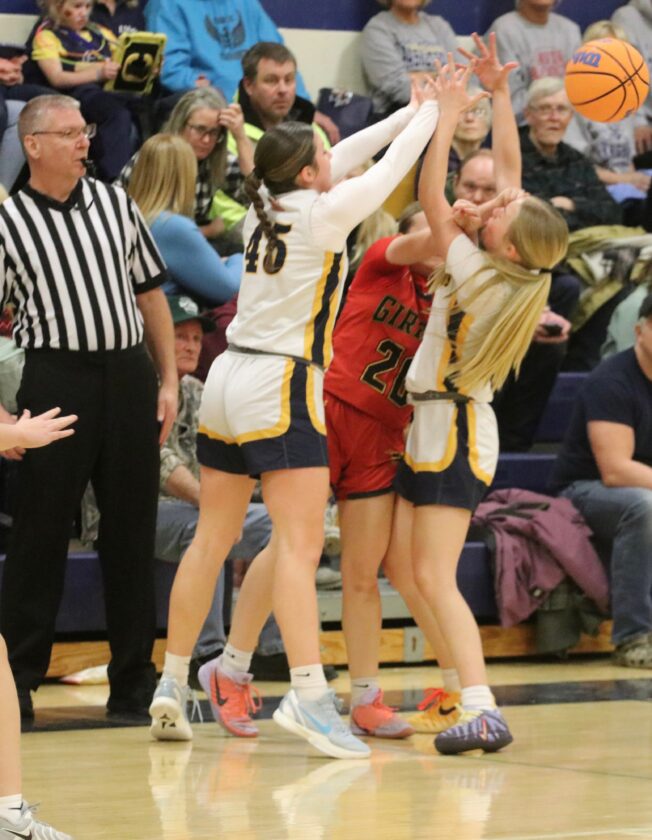 Times Observer photo by Steve Younger Eisenhower’s Clara Steinberg (45) and Laney Belcher surround Girard’s Liv Bax during Thursday night’s region basketball game at Eisenhower High School.