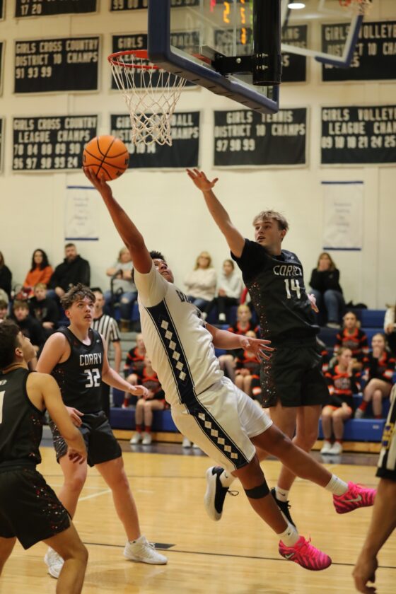 Warren’s Lucas Thrift scores in close on his way to a game-high 28 points to lead the Dragons to a 69-57 victory over Corry on Tuesday night. Photo by Mark Evans