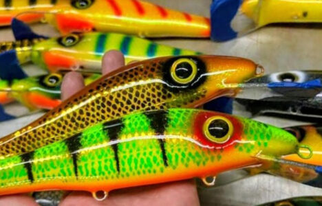 Photo courtesy of Schoss Bait Company Musky lures can be big and bigger, and beautiful — like these, some are over 1 foot long. Custom lure makers will be on hand at the Musky Expo this weekend.