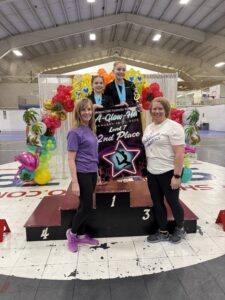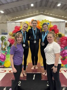 - Level 7, left to right: Coach Emily Onuffer, Ruth Sienkiewicz, Harper Christie and Coach Kristy Turner.