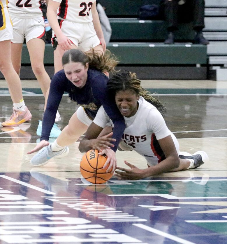 Times Observer photo by Steve Younger Eisenhower’s Clara Steinberg and Northwestern’s Makayla Presser-Palmer dive for a loose ball during Wednesday’s District 10 Class 3A semifinal at the Mercyhurst Athletic Center in Erie.