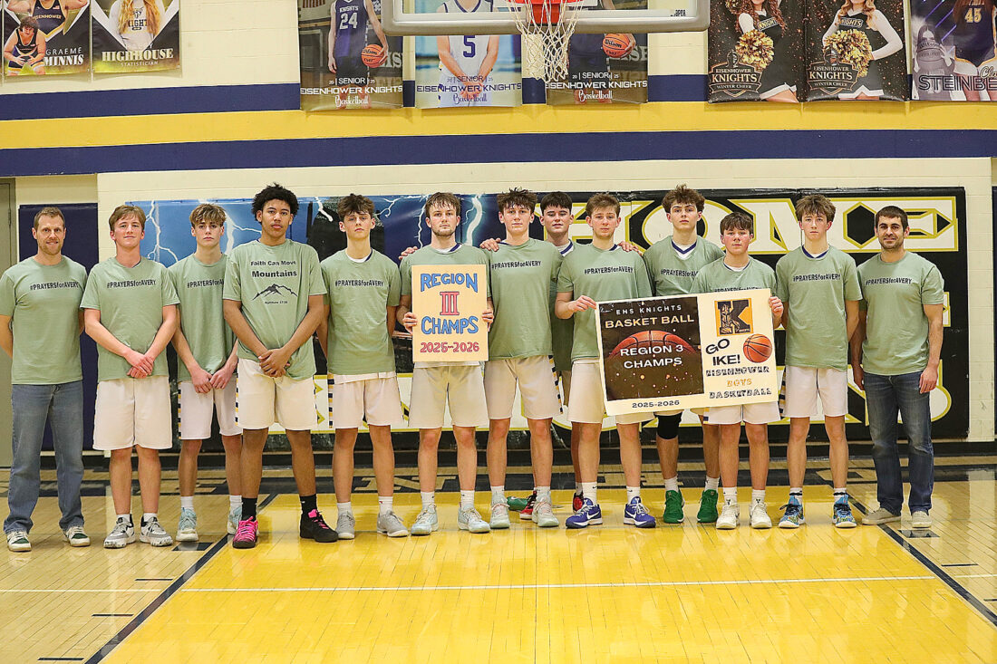Times Observer photo by Steve Younger The Eisenhower boys basketball team poses together after clinching the Region 3 championship Friday.