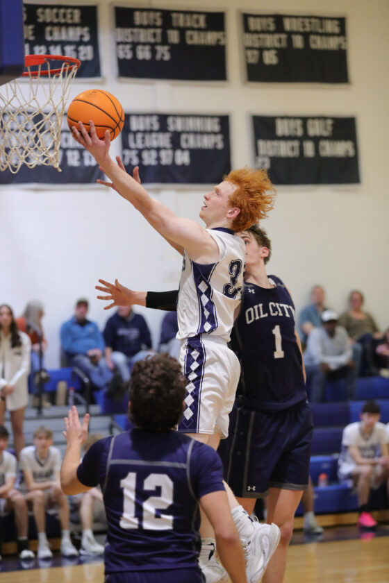Photo courtesy of Mark Evans Warren’s Landon Wood takes the ball to the basket while being defended by Oil City’s Michael Fink (1) during Friday’s Region 5 boys basketball game at Warren Area High School.