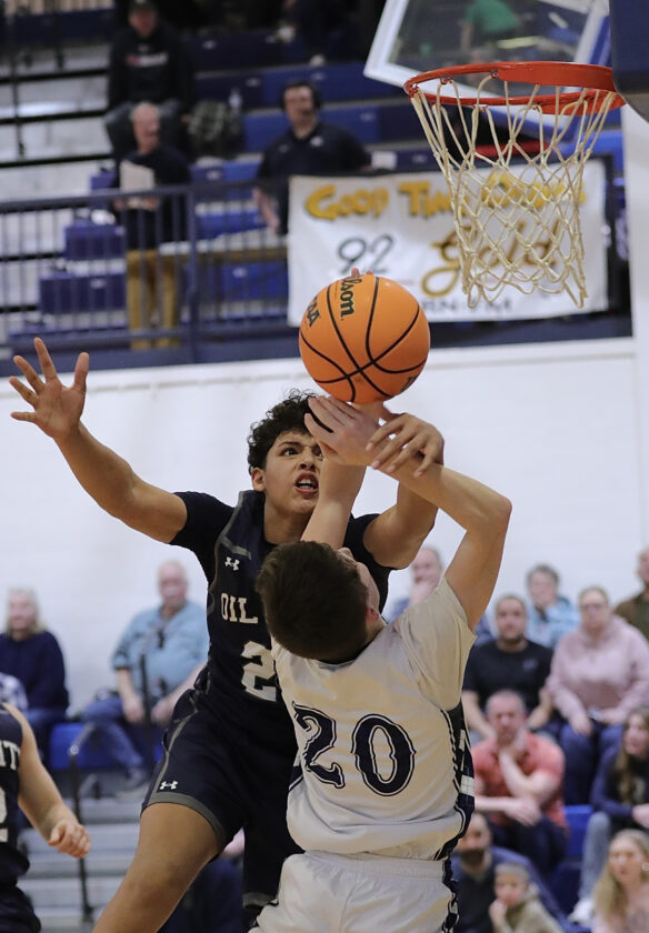 Photo courtesy of Mark Evans Warren’s Allen Eaton (20) is fouled by Oil City’s Isaiah VanWormer (21) during Friday’s Region 5 boys basketball game at Warren Area High School.
