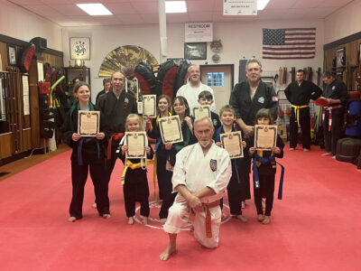 The following people earned promotions at Johnson’s Black Belt Academy. In the front row is Master Rick Johnson, 10th Degree Black Belt and school owner; In the second row, from the left, are Aria Pannel to Yellow Belt, Myleigha Mack to Blue Belt, Owen Donoval to Green Belt and Kerrigan Seybert to Blue Belt; In the third row are Peytyn Mack to Purple Belt, Juliette Seybert to Blue Belt and Stephen Haight to Purple Belt; and in the back row are Travis Lantz, 9th Degree Black Belt/Testing Board, Erik Krantz, 6th Degree Black Belt Testing Board and Don Nelson, 9th Degree Black Belt/Testing Board.