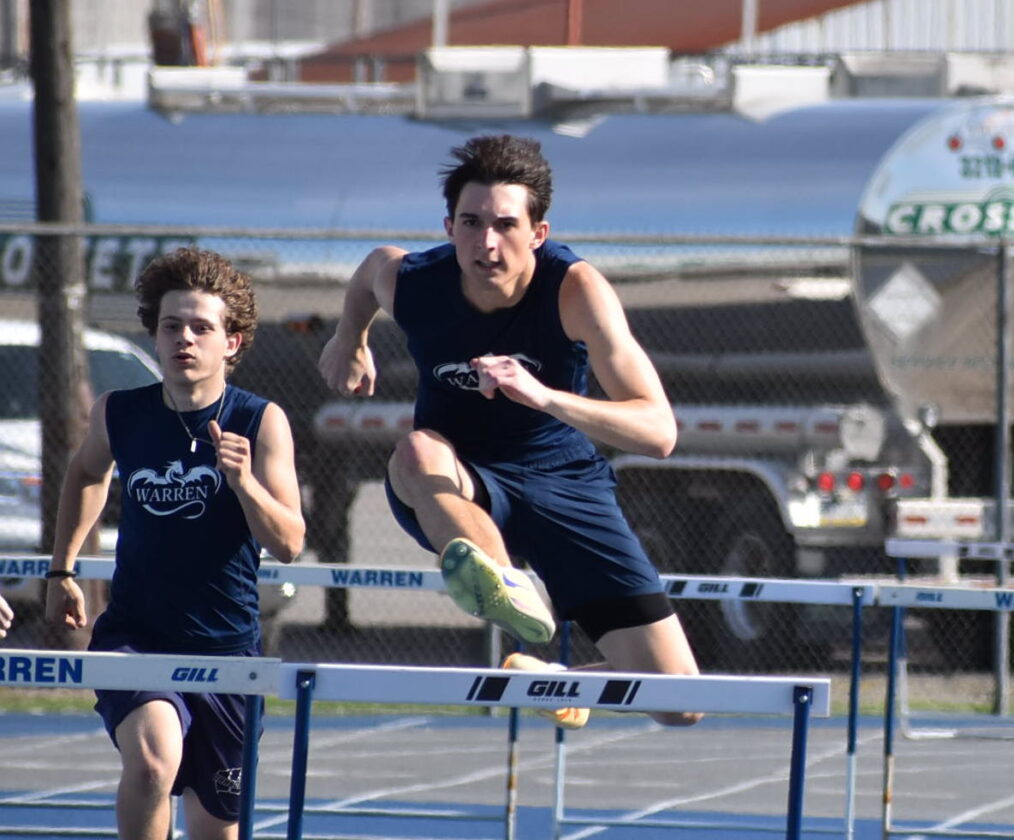 - Warren’s Adon Maier clears a hurdle on his way to first in the 300-meter hurdles.