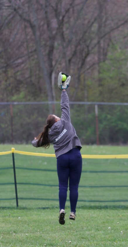 Times Observer Photo by Steve Younger Eisenhower’s Alexis Pascuzzi makes a leaping catch during Tuesday’s Region 3 softball game against Mercyhurst Prep.