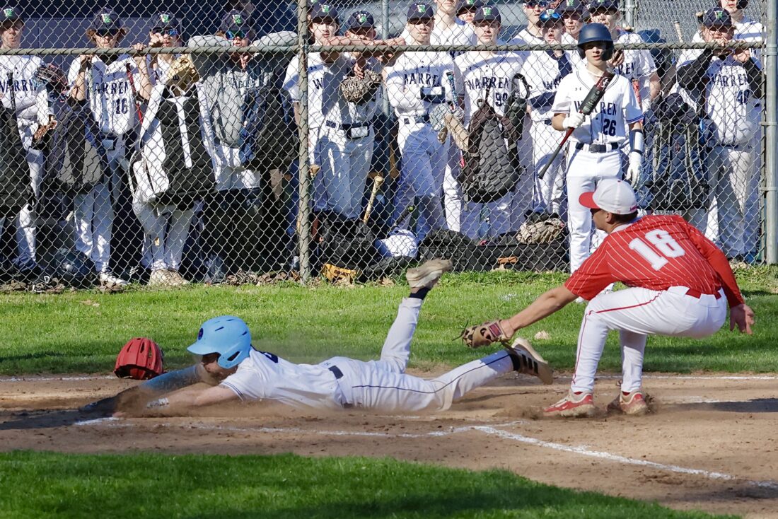 - Warren’s Eli Snyder beats the tag from General McLane’s Charlie Salvo. Photo by Mark Evans