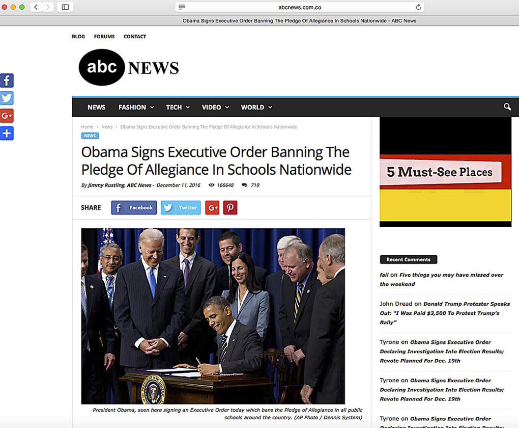 Associated Press photo This Feb. 6, 2017, screen shot shows a website that falsely implies that it is from ABC News. The site is actually an imposter pedaling stories that aren’t true.