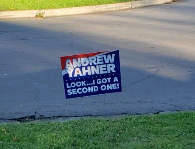 Yahner has created several yard signs regarding himself and his wife that have brought a little levity to the local political cycle. One sign reads “Andrew Yahner – not running for anything, I just wanted a sign.” Subsequent signs read: “Look…I got a second one!” and “My wife is getting mad I’m spending money on these signs.”