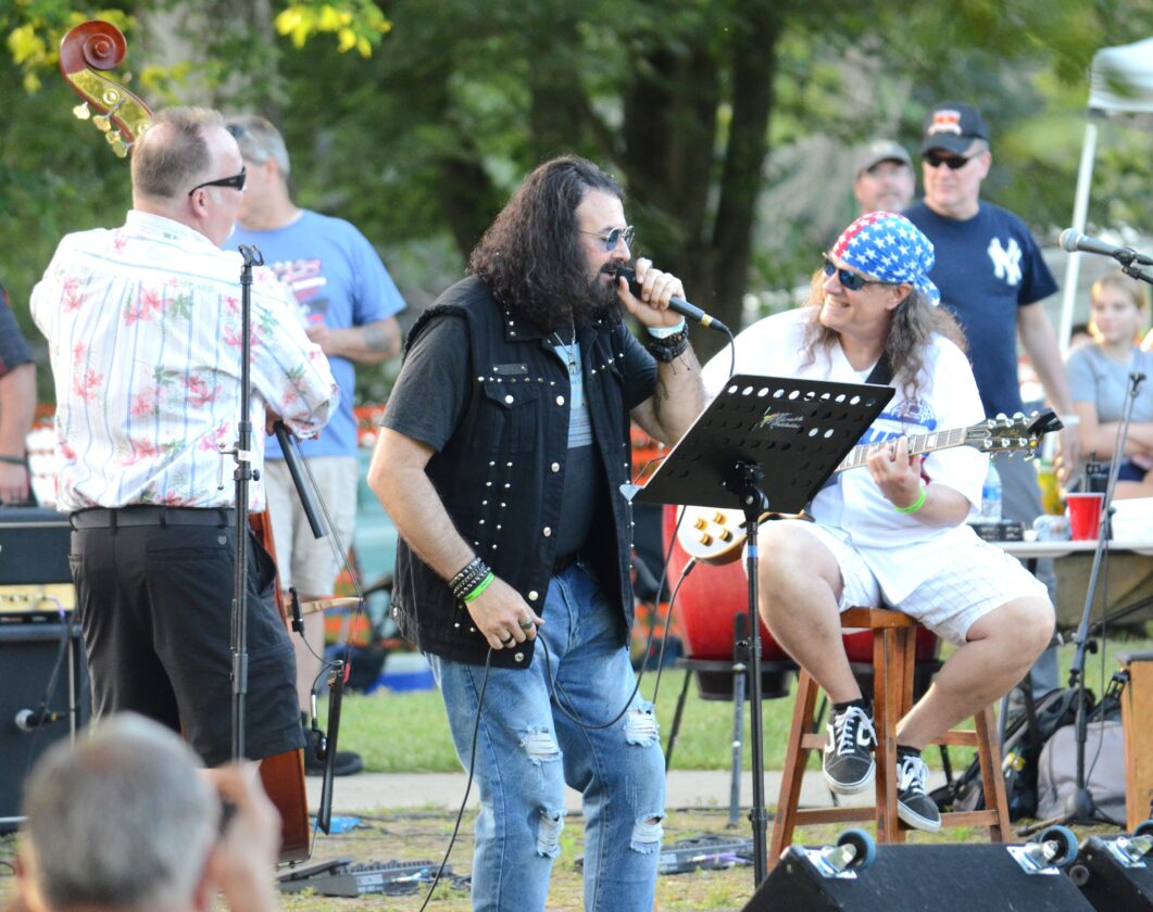 Allegheny River Monsters and members of the Warren Area High School class of 1982 (from left) Jim Cheronis, Todd Singleton, and Pat Hackett, with Johnny ‘Sticks’ Salerno (also class of 82) on drums, perform Rock This Town by Stray Cats during Warrenstock 2022.