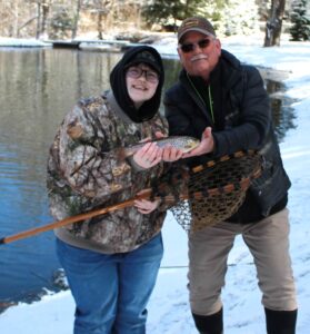 - Photo submitted to Times Observer Tidioute Community Charter School senior fishing club member Arreanna Anderson poses with Lodge at Glendorn Guide Jim Minich and a fish she caught during a recent fishing club outing to Glendorn.