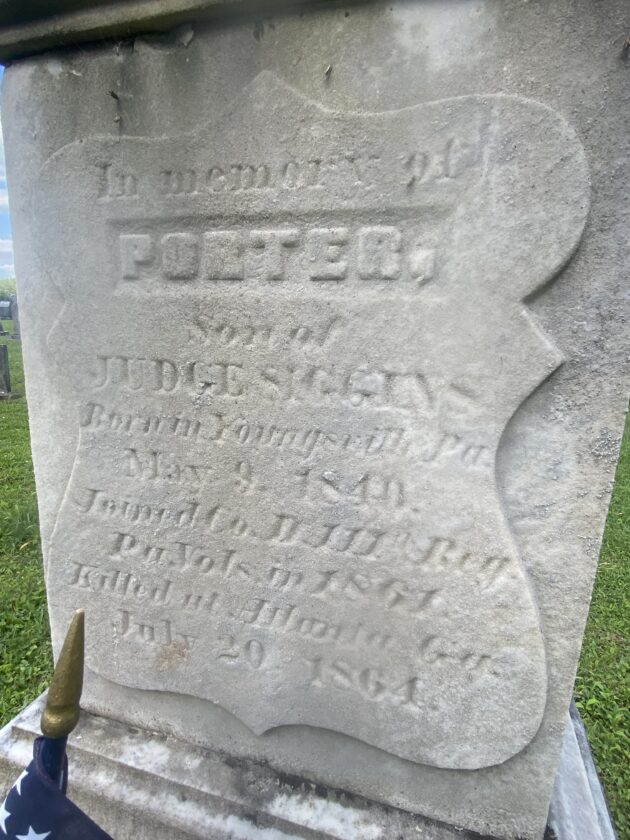 “It is with a feeling of deep sadness that I write to you of your son Porter’s death. He was instantly killed in the battle of the 20th by a shot through the heart. I buried him beside three more of his comrades who fell at the same time. I had his grave plainly marked, so that if at any future day you may wish to remove his remains, the grave can be easily found.