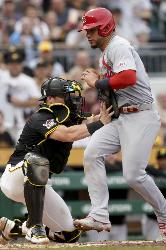 AP Photo Pittsburgh Pirates catcher Henry Davis, left, tags out St. Louis Cardinals’ Willson Contreras at home during the fourth inning of a baseball game Tuesday in Pittsburgh.