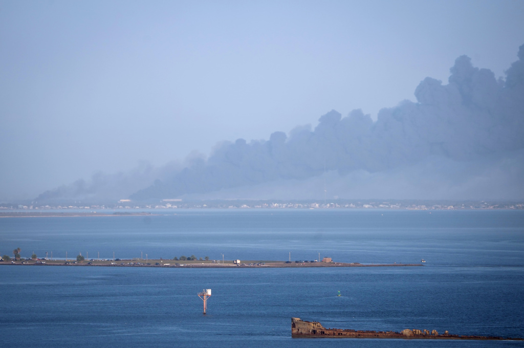Smoke from a fire at PHR Peakers plant is seen from Galveston on Sunday, Nov. 16, 2025. (Jill Karnicki/Houston Chronicle via AP)